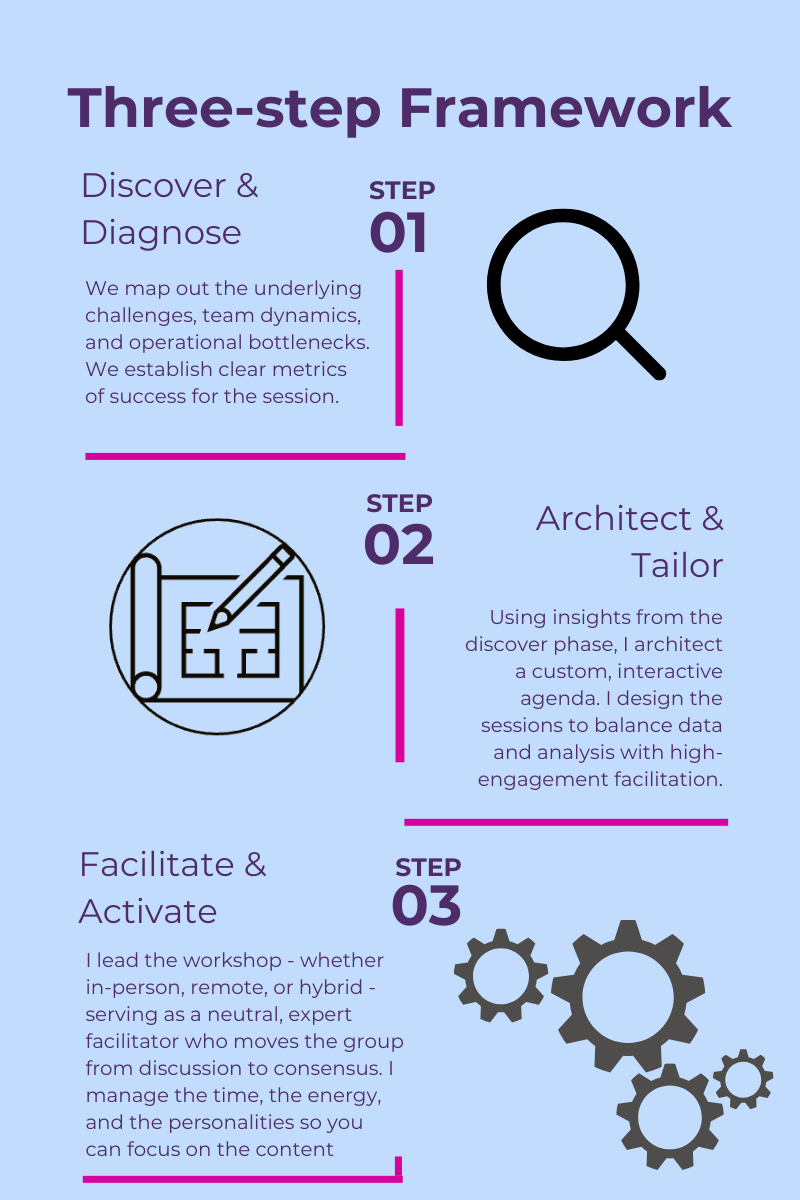 I don’t believe in “off the shelf” solutions. Every organization has a unique culture and set of objectives, so every workshop I facilitate is built from the ground up. Using a three-step framework I work closely with you to identify core goals – even those not yet fully defined – and create a custom, interactive agenda. During the session, I will manage the time, the energy and the personalities to keep us on track.